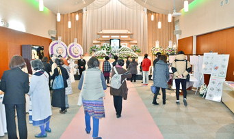 シンプルでありながら、直線と曲線を未来的にアレンジした建物が特徴の施設は、一般葬から家族葬まで幅広いスタイルに対応しております。葬祭展当日はセレモニーアルコ互助会会員をはじめ、平・小名浜地区はもちろん、市内の多くの地域からご来館いただきました。